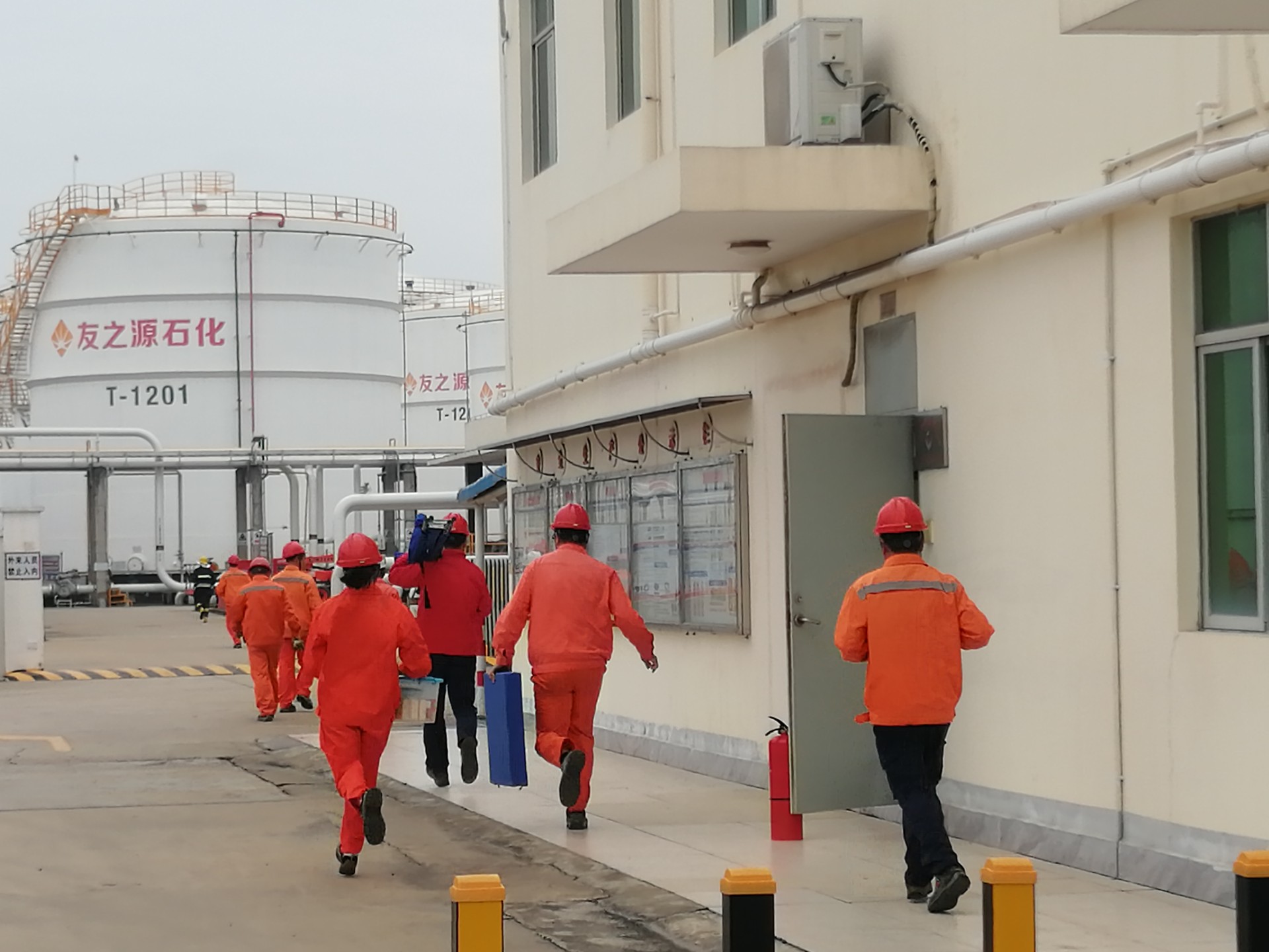 興盛油庫(kù)組織全體員工模擬進(jìn)行T1108罐汽油泄漏、火災(zāi)事故應(yīng)急演練