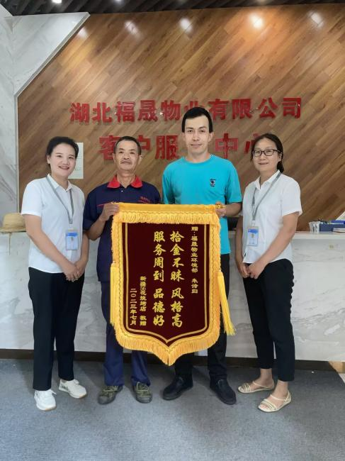 8月14日下午,百晟首府“新疆56花燒烤店“商戶老板帶著一面寫著“拾金不昧風(fēng)格高, 服務(wù)周到品德好”的錦旗來到福晟物業(yè)服務(wù)中心,專程表達了對綠化保潔員朱詩歸的感謝。
