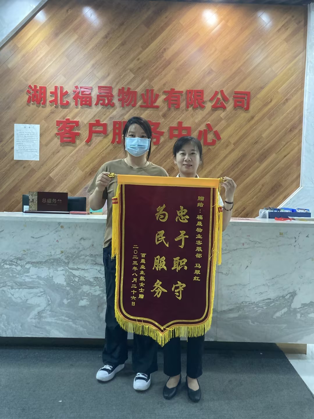 一面錦旗,一聲好評,一份滿意,是對物業(yè)服務(wù)工作人員的最大“褒獎(jiǎng)”,每一面錦旗都記錄著感動與溫暖,每一次感謝都承載著認(rèn)可與肯定。8月27日,湖北福晟物業(yè)中心先后走進(jìn)了這樣的兩位業(yè)主,4-2-3002和13-2-1303的業(yè)主心存感恩之意,各自帶著錦旗來到物業(yè)服務(wù)中心,贈予樓管家魏坤珍和馬翠紅。