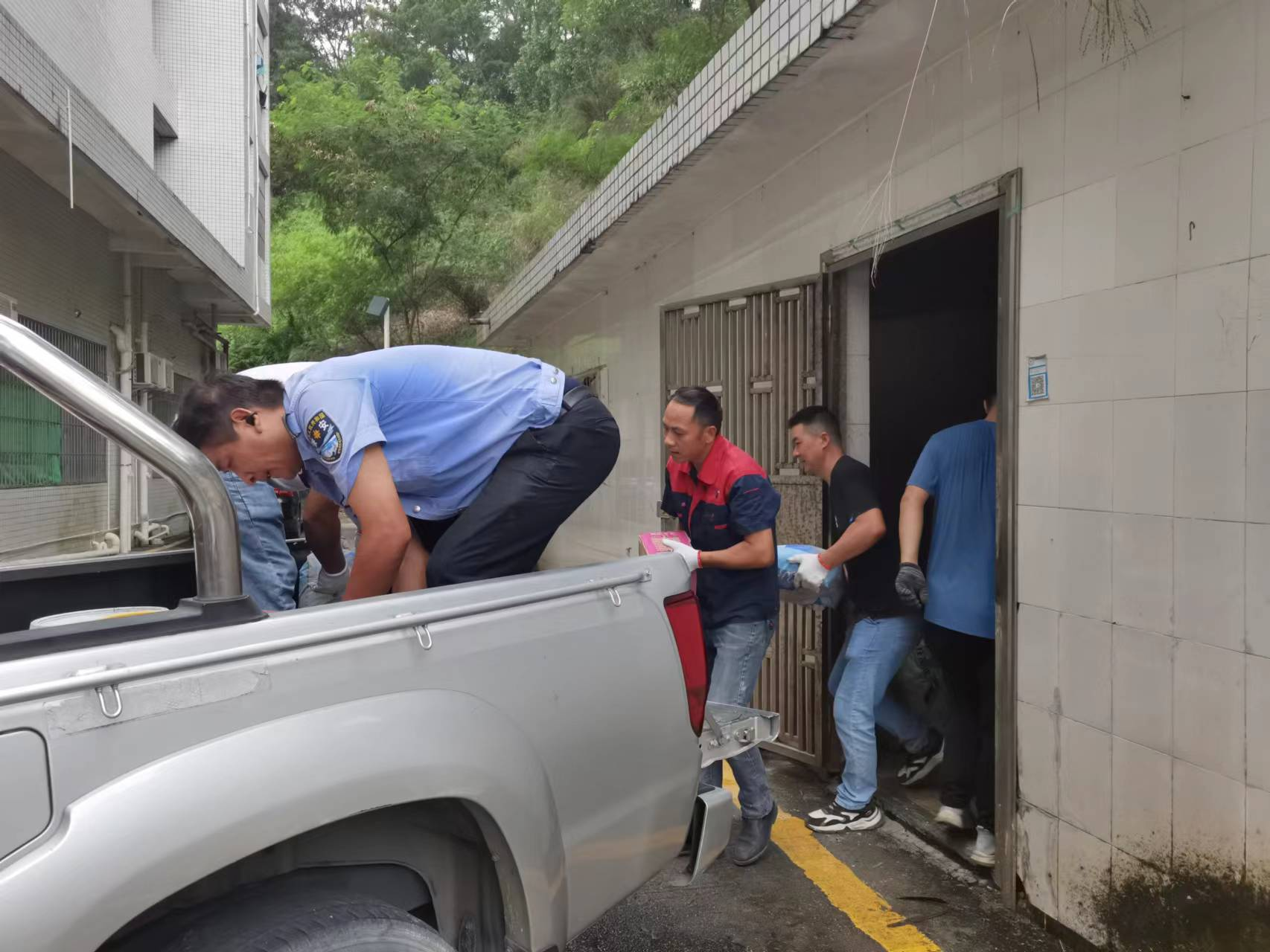 由于年長月久,倉庫里面的材料較多,從倉庫人工搬運到皮卡車上,再從車上又放置另一個倉庫存放,一個接一個地搬運著水泥、瓷磚等維修雜物,這樣來來回回拉了八車之多。